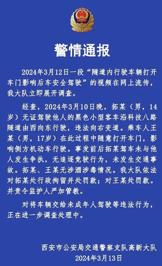 经查,3月10日晚,拓某(男,14岁)无证驾驶他人的黑色小型客车沿科技八路隧道由西向东行驶,违法向右变道。乘车人王某 (男,17岁)在此过程中随意打开车门,影响侧方机动车行驶。事发前后拓某驾车未与他人发生争执,无追逐竞驶行为,未发生交通事故。拓某、王某无涉酒涉毒情况。大队依法对拓某处行政拘留并处罚款;对王某处罚款。并责令监护人严加管教。