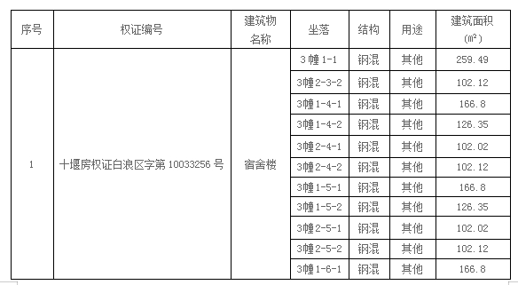 位于十堰市白浪东路63号一座大型工厂低价拍卖出售,整个工厂由生产区、生活区两部分组成,房产总面积:11346.52平方米。