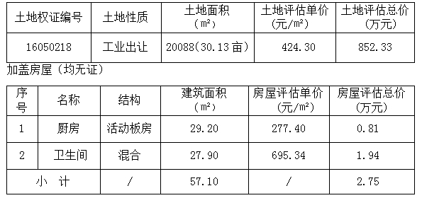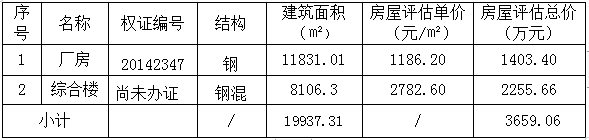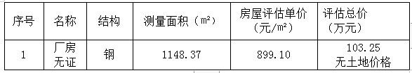 厂房面积约1100平方米,层高约11米。该厂房房产评估价为103.25万元,现拍卖参考价80万元(单价690元/㎡),竞买保证金10万元。所拍标的产权信息、名称、范围、数量等基本情况见《委托评估资产评估明细表》: