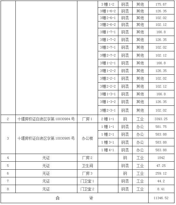 所拍工厂位于樱桃沟路口,左侧是石文建材,右侧是惠众科创园。整个工厂由3栋工业厂房组成,厂房合计总面积为19354.45平方米,左右两个厂房层高约12米,中间厂房高约10米,土地面积为31036.5平方米(约46.6亩)。工厂评估总价3490.95万元, 现拍卖参考价2000万元(单价1000元/㎡),竞买保证金150万元。工厂交通方便、厂房高大适合各类工商业生产,商机难得。所拍标的产权信息、名称、范围、数量等基本情况见《委托评估资产评估明细表》: