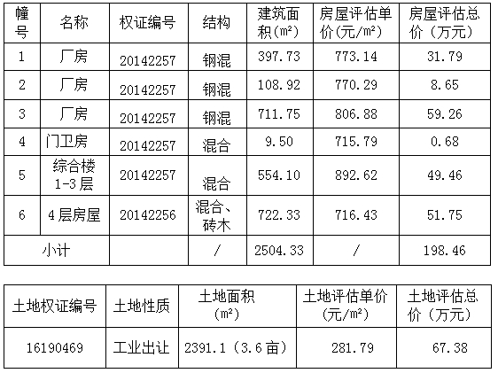 所拍工厂由厂房和综合楼两部分组成,房屋建筑面积合计共2504.33平方米,土地面积2391.10平方米(约3.6亩)。