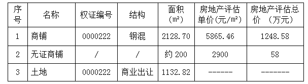 市场估价1744.17万元,现整体拍卖参考价900万元(单价790元/㎡),竞买保证金100万元。所拍标的产权信息、名称、范围、数量等基本情况见《委托评估资产评估明细表》: